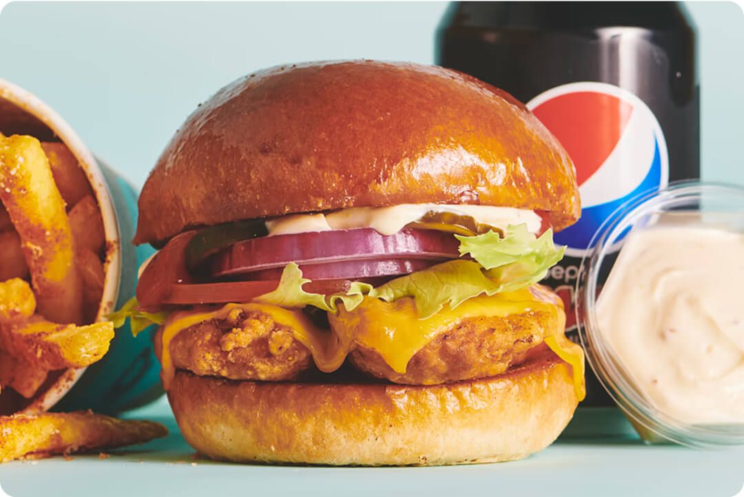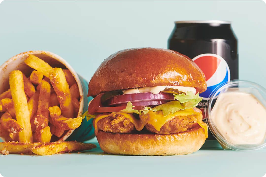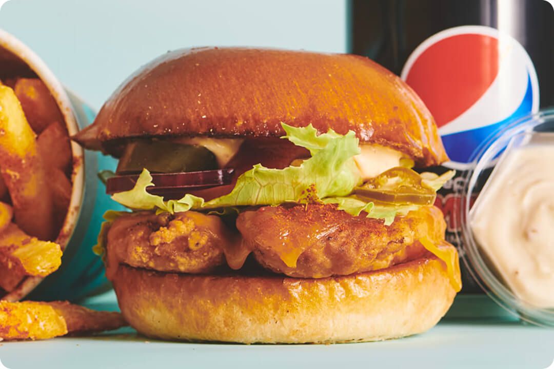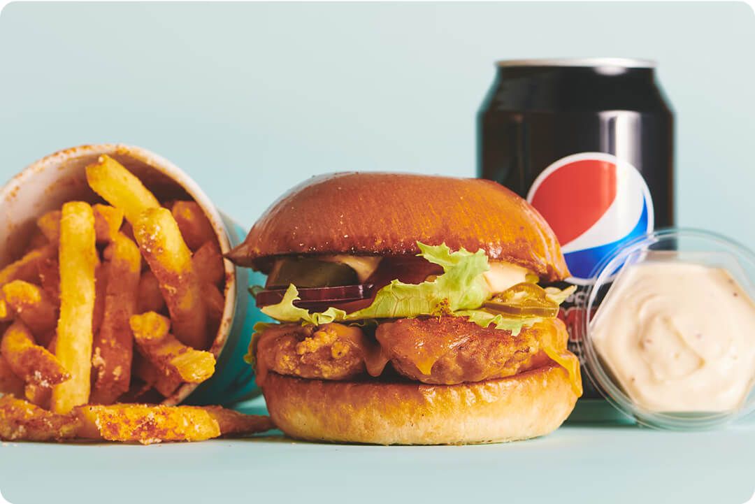 Fried chicken, cheddarost, frisk salat, løg, jalapeños, tomat, louis chilimayo og spicy krydderi i en lun burgerbolle. Serveres med stor pommes frites, 2x dip og en dåsesodavand.