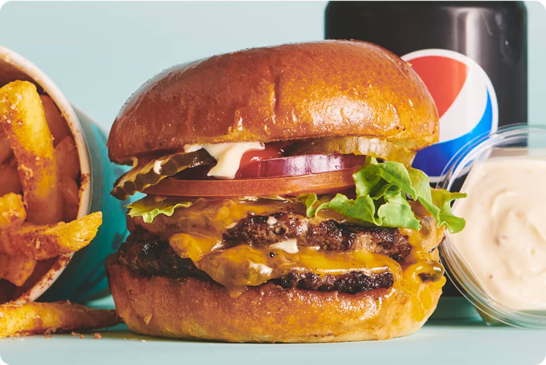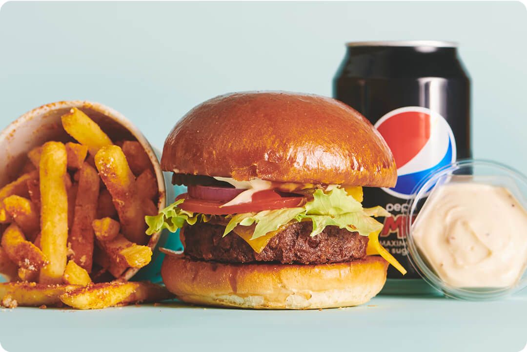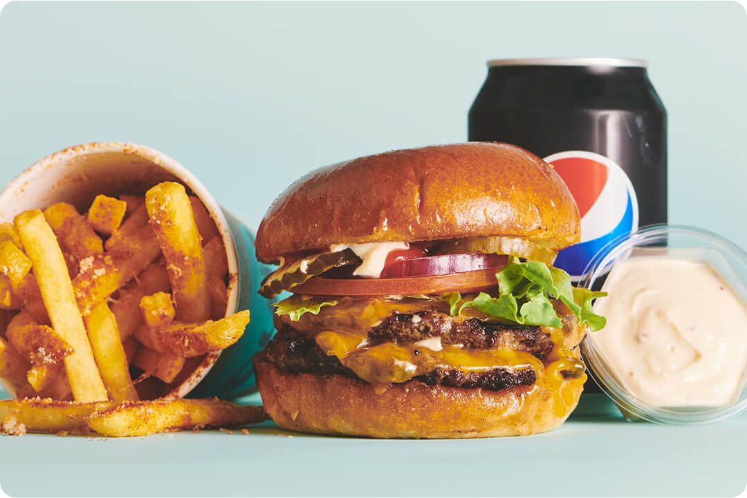 2 x flammegrillet bøf, cheddarost, salat, løg, pickles, tomat, Louis mayo og ketchup i vores lune bolle. Serveres med fries, valgfri dip og sodavand.