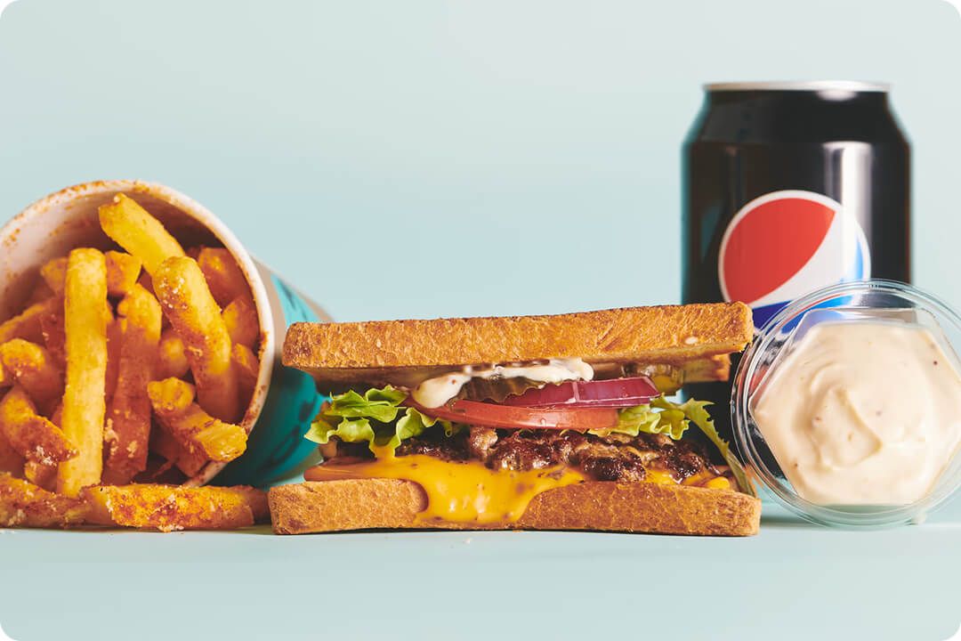 Flammegrillet bøf, cheddarost, salat, løg, pickles, tomat, Louis mayo i vores ristet toast. Serveres med fries, valgfri dip og sodavand.