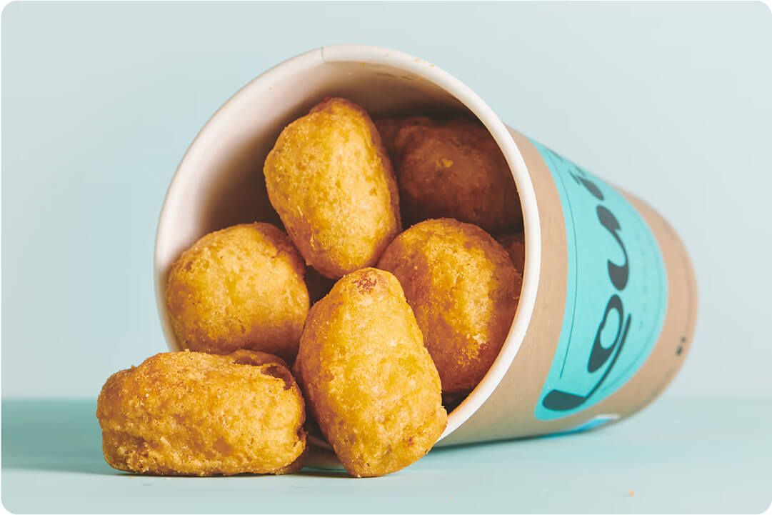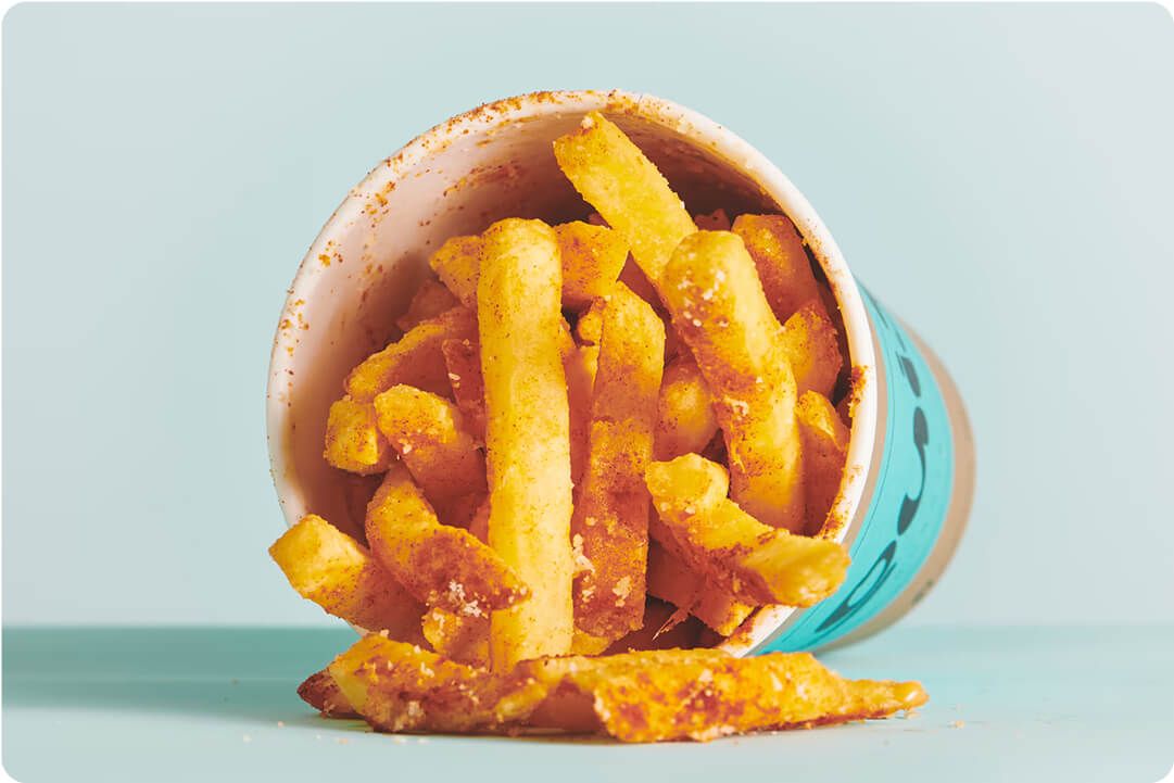 Sprøde fritter med parmesan og paprika. Serveres med valgfri dip. Fås i lille og stor.