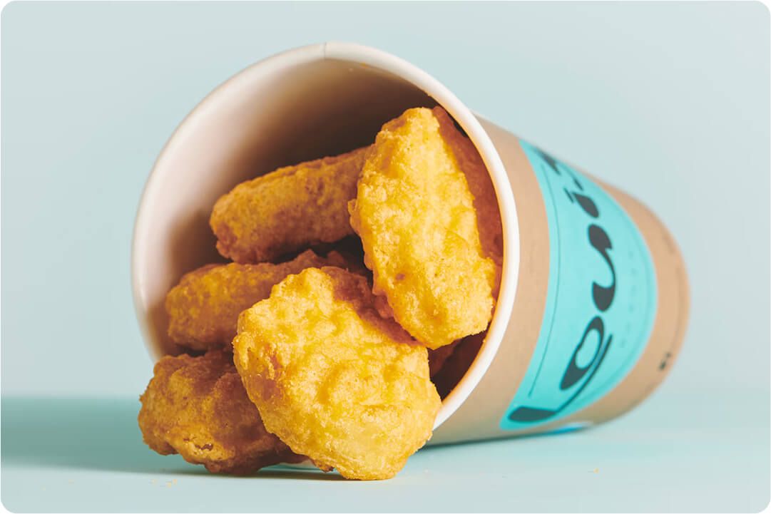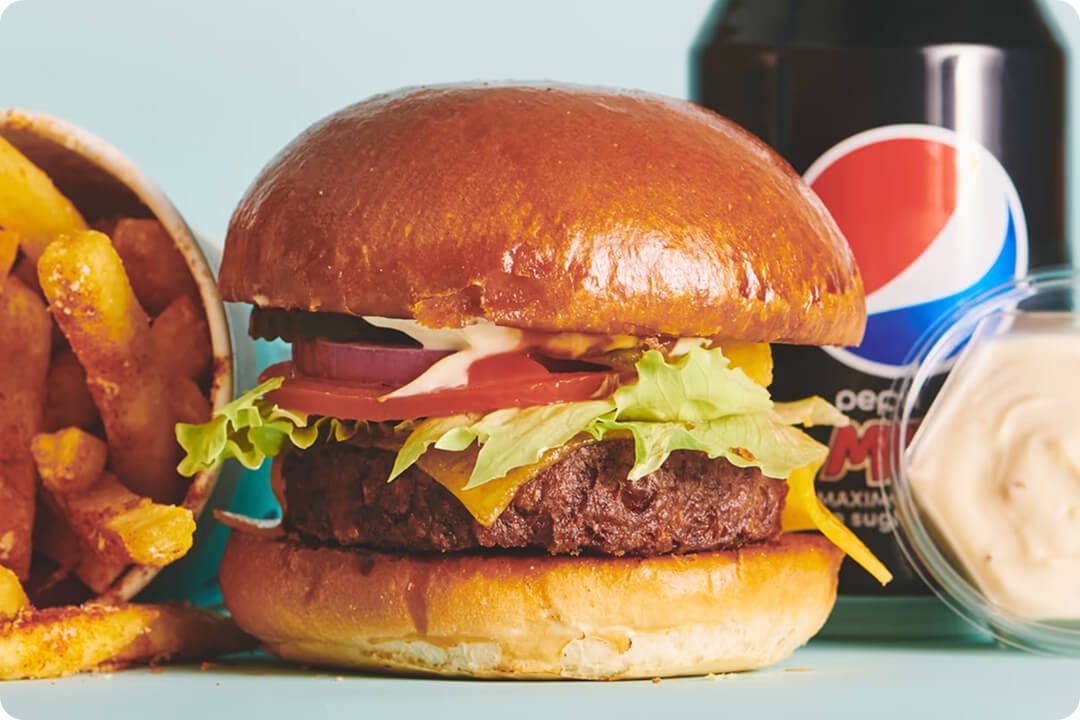 Vegansk bøf, cheddarost, salat, løg, pickles, tomat, Louis mayo og ketchup i vores lune bolle. Serveres med fries, valgfri dip og sodavand.