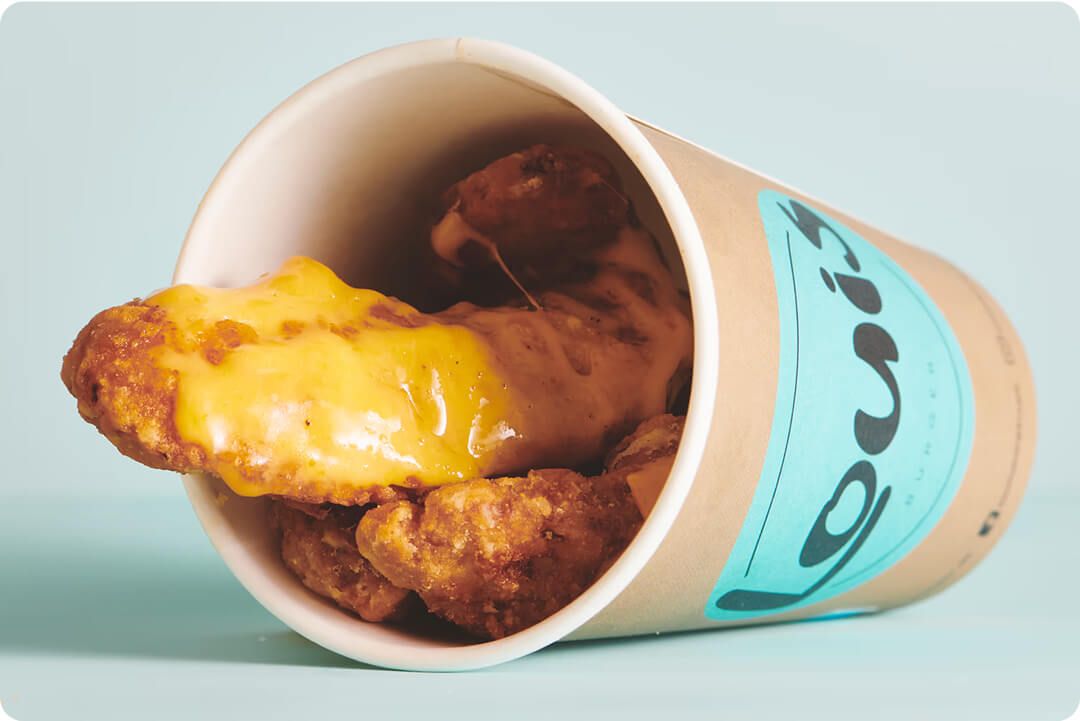 Fried chicken, cheddarost, salat, løg, pickles, tomat, Louis mayo og ketchup i vores lune bolle. Serveres med fries, valgfri dip og sodavand.